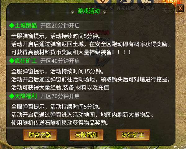 5.游戏活动,本服活动分每日活动,合区活动,每周活动,等等,活动奖励异常丰厚,且活动绝对公平,优先考虑散人玩家!